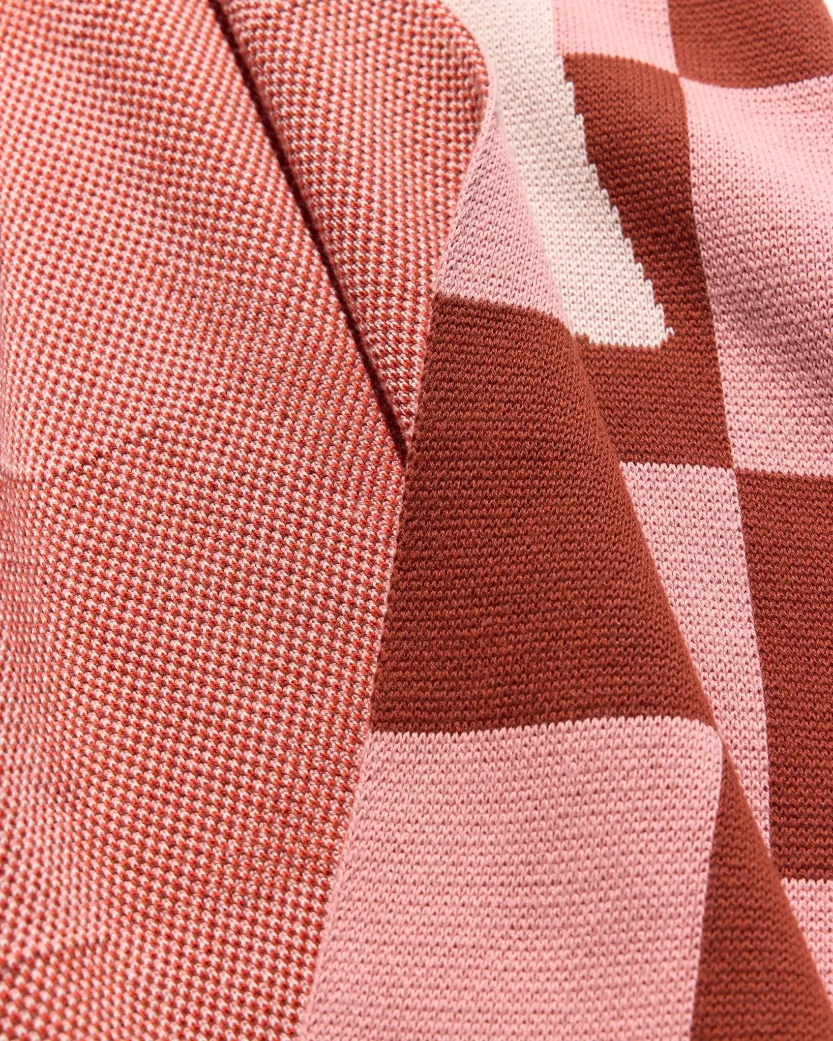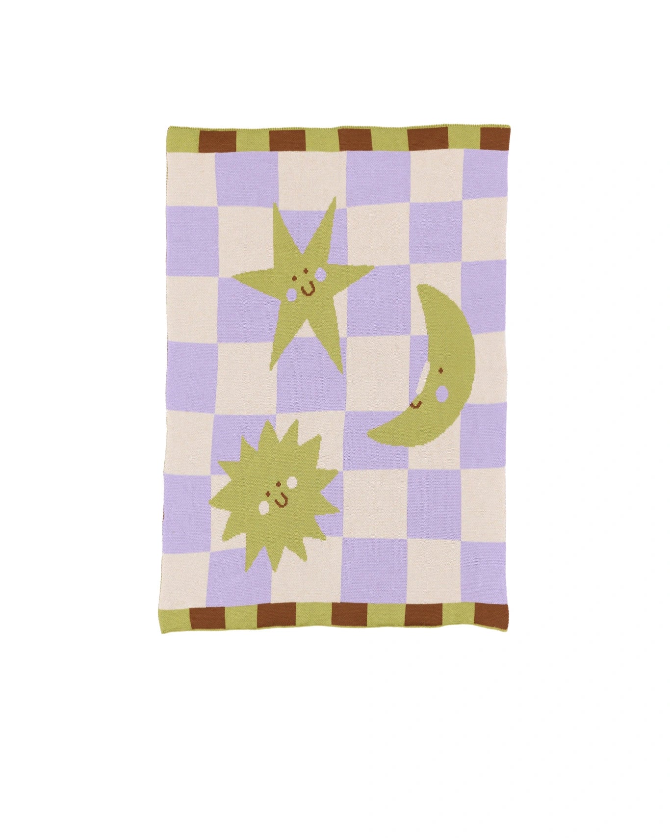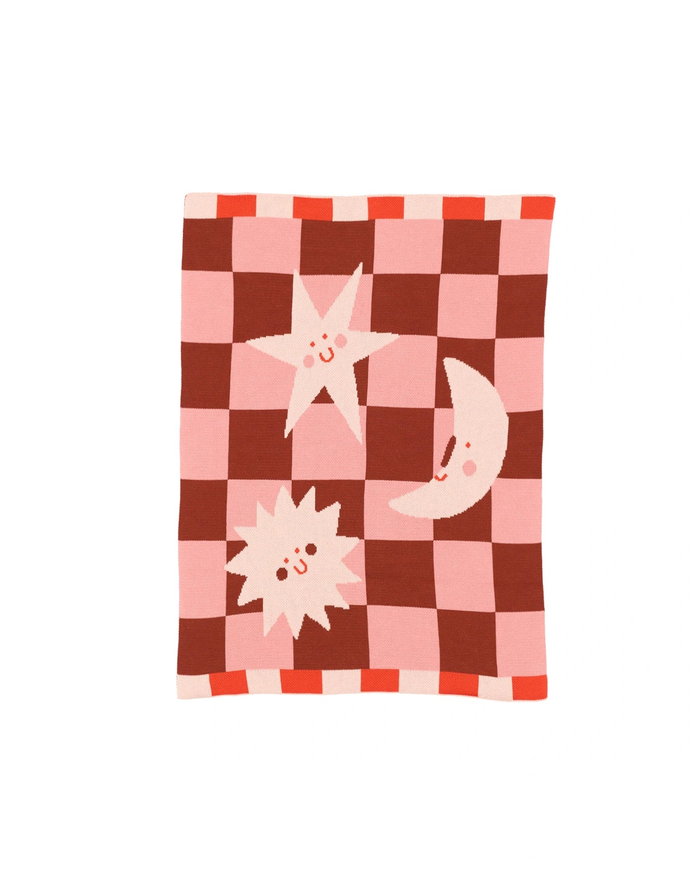 Rosie Caitlin's sleepy celestial faces beam gently over a checkered background. A dreamy cuddle companion.