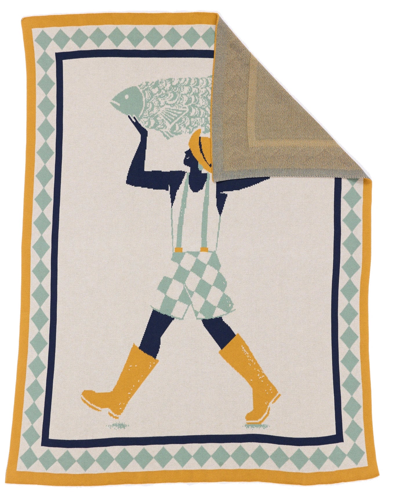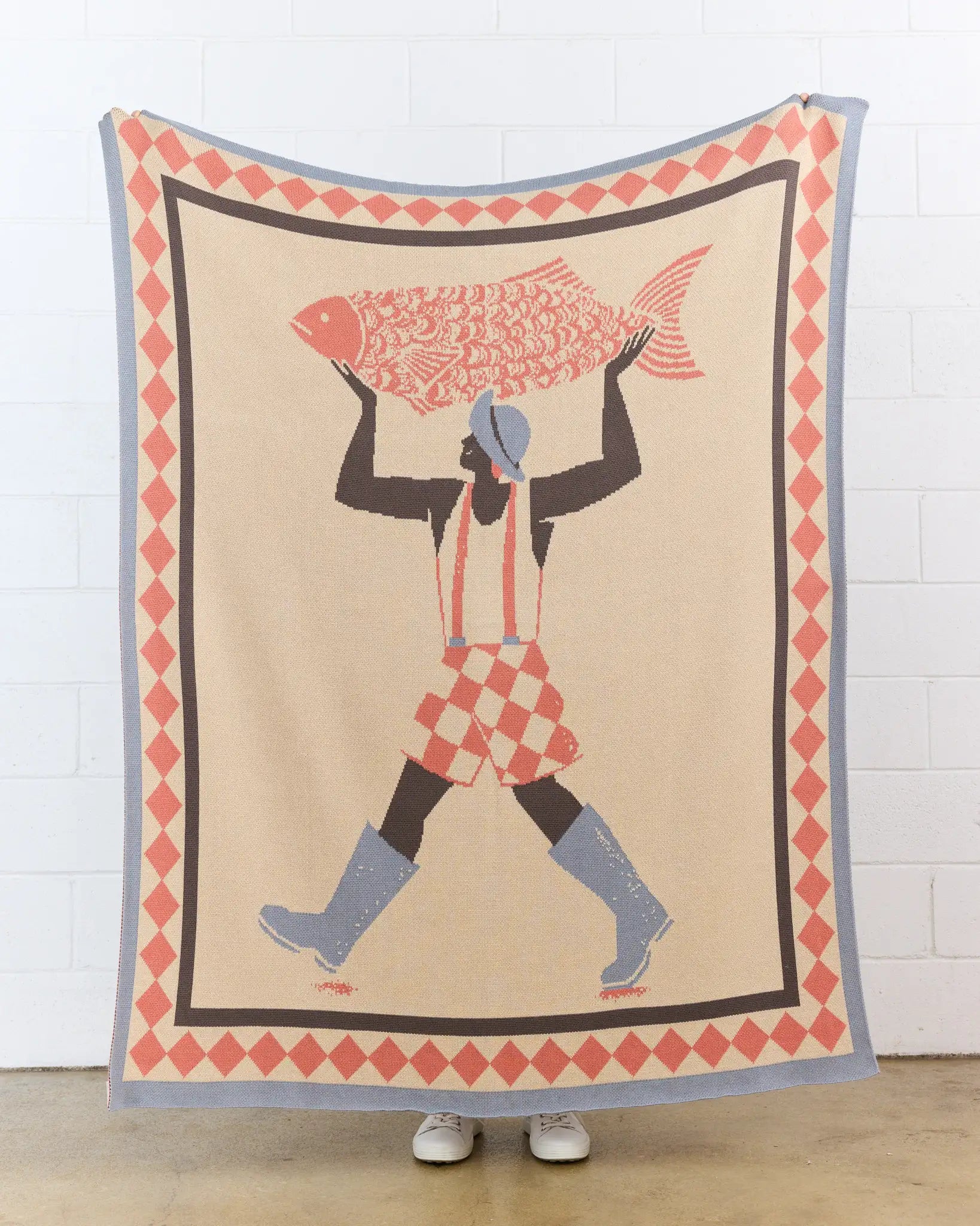 Alice Des conjures whimsical coastal energy as a fisherman reels in a poetic fish. The illustration pops with wit and simplicity, crafted in ultra-soft knit cotton.
